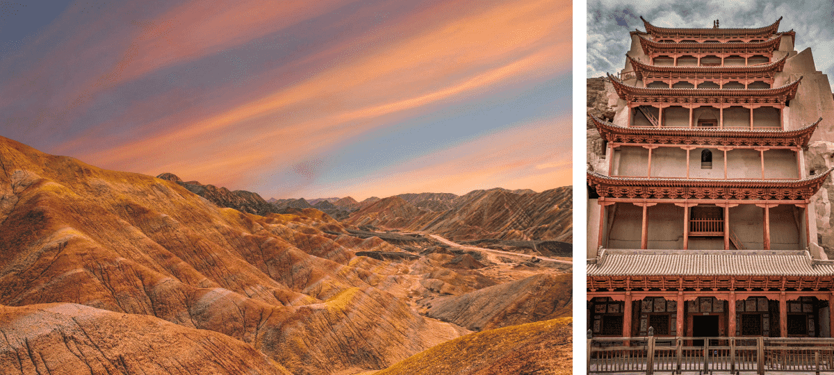 坐着高品质旅游列车踏上青甘大环线的路程,已经很惊喜了。在升级版行程,对比市面上常规行程,我们在敦煌增加了玉门关、阳关、丹霞地质公园,同时配备了专业设备及观星老师;在莫高窟的姊妹窟——榆林窟的行程中增加至了3个特窟的参观;在嘉峪关,你还将打卡天下第一墩;在张掖,除了七彩丹霞的深度游外,还增加了裕固族生态走廊的景点。